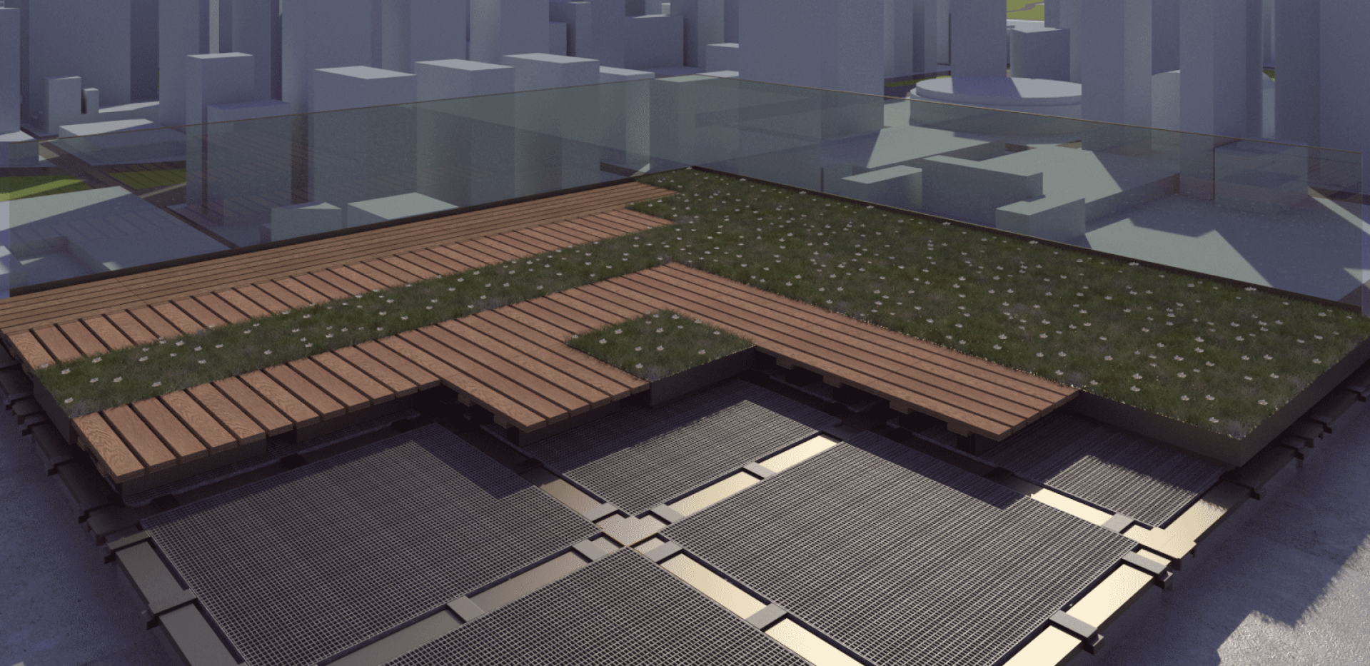 Objetivo de aumentar o desempenho energético do edifício, recolhendo e armazenando a água da chuva, e prevendo a utilização da área de cobertura como espaço de lazer ajardinado, integrado com equipamento para a produção autónoma de energia elétrica.